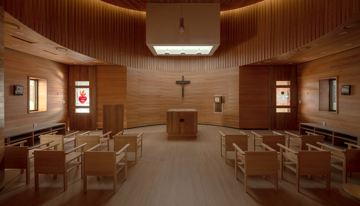 은퇴한 사제들이 소규모 공동체를 이루어 생활하는 수도원으로 춘천시 인근에 위치한다. 단순한 종교시설이 아닌 남은 여생을 살아가는 마을로 느껴질 수 있도록 시설을 하나로 엮는 마당을 계획하여 커뮤니티의 중심공간이 되도록 했다. 마당은 하루의 일과를 보내는 동안 자연스럽게 사람들이 마주칠 수 있도록 동선을 구성하고, 곳곳에 다양한 삶의 모습이 마당에 담기도록 했다. 언덕에 위치한 협소한 대지를 합리적으로 활용하기 위해 능선을 따라 사제관을 배치해 전실 남향 채광과 열린 조망을 확보했다. 식당, 공동거실 등의 주요시설은 사제관 후면에 배치해 동선을 집중하고, 경당은 상징적인 입면과 공간을 갖는다. 사제관과 공동시설의 서로 다른 디자인 어휘는 각 시설의 성격을 나눠주는 동시에 시설 내의 풍경을 다양하게 만들어준다. 개인실은 쾌적하고 건강한 거주공간인 동시에 성찰과 수도의 공간이 되도록 구성했다.