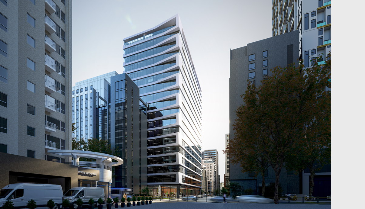 P-GENESIS는 지상 17층 규모의 업무시설로, 강남대로에서 한 켜 물러나 도시적 전면 공지와 적절한 거리감을 확보하도록 배치되었다. 대지는 다양한 시대와 건축 언어가 혼재하는 강남 후면 도시경관 속에 위치하며, 이에 대응해 정제된 수평 띠의 적층 매스를 적용하여 차분하고 질서 있는 도시적 파사드를 구현하였다. 모서리부는 전면 돌출로 거리에서의 인지성과 상징성을 확보하고, 띠와 코너 요소는 입면 조건에 따라 사면 처리와 두께 변화를 적용하여 입면 리듬과 깊이감을 강조하였다. 남측 입면에는 BIPV 시스템을 파사드 구성 요소로 통합하여, 단순 설비가 아닌 입면 디자인의 일부로서 지속가능성과 조형적 완결성을 동시에 확보한 설계 전략을 구현하였다.