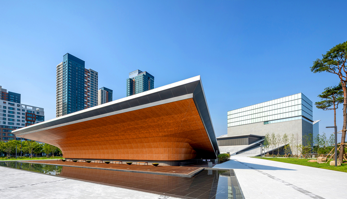 가장 감동적이고 웅장한 도시적 스케일의 뷰를 선사하여 드라마틱한 배치를 선택하였다. 두 개의 비상하는 지붕사이의 광장은 하늘을 담으면서 인근 동락정역사공원과 중앙상징광장을 연결하는 문화벨트가 이어진다. 북측 중앙상징광장의 가로광장의 대응하는 직선의 선형을 유지하고, 남측은 문화, 녹지-벨트의 흐름이 끝나는 동락정 역사공원과 대화하기 위한 포옹하는 듯 곡선을 하여 시민들을 아트센터로 안내하는 직성의 도시선형과 녹지를 향산 시민들의 감성에 부응하는 자연의 곡선형상이 공존하는 조형을 만나게 된다. 건축적인 조형 어휘는 대극장 포이어 댄싱클라우드의 유려한 곡선으로 이어지고, 이 흐름은 대극장 내부의 벽체와 천장까지 전이되어 아름다운 곡선으로 가득한 음악과 문화에너지를 느끼게 하는 공간이 연속된다.